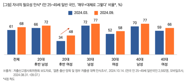 우리 국민은 자녀의 필요성에 대해 어떻게 생각하고 있을까?만 25~49세의 일반 국민 10명 중 7명(68%) 정도가 자녀가 있어야 한다는 데에 동의했다. 자녀 필요성 동의율은 6개월 전 조사 대비 전 연령대에서 증가했는데, 특히 20대 후반 여성의 증가 비율(34%→48%)이 두드러졌다.