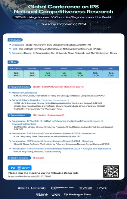 서울과학종합대학원대학교와 유엔훈련조사연구소(UNITAR), SDG Management School이 공동 주최하고, 국제경쟁력연구원이 주관하는 2024 글로벌 국가경쟁력 콘퍼런스가 한국 시간 10월 29일 22시에 개최된다.