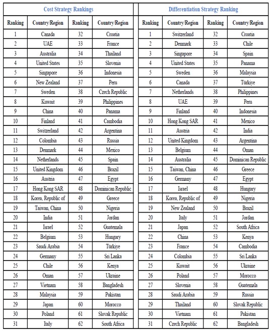 아래 표 1은 2024년 두 전략 순위의 결과를 보여준다. 비용 전략과 차별화 전략에 기반한 순위는 눈에 띄게 다른 결과를 보인다. CS 순위에서 캐나다(1), 아랍에미리트(UAE)(2), 호주(3), 미국(4) 등 상위 4개 경제권은 모두 풍부한 자원을 보유하고 있다는 특징이 있다. 반대로 DS 순위에서는 스위스(1), 덴마크(2), 싱가포르(3), 미국(4) 등 선진국이 상위권을 장악하고 있다.