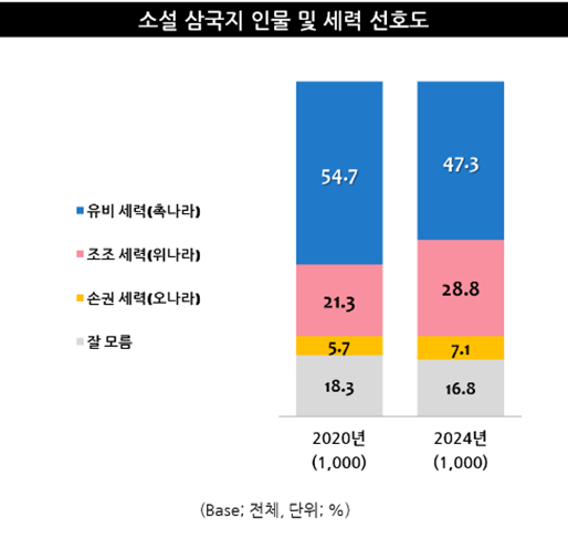불확실성이 큰 사회 분위기 속에서 개인의 경쟁력을 빠르게 키워야 한다는 필요성이 강조됨에 따라, 조조와 같은 성과 지향형 리더십이 지지를 얻고 있는 것으로 풀이된다. 실제로 전체 응답자의 상당수가 삼국지에 등장하는 인물 호감도는 매년 트렌드에 따라 변하는 것 같다(58.4%, 동의율)고 평가한 만큼, 리더십에 대한 호감도 역시 시대적 변화와 사회 분위기의 영향을 받고 있는 것으로 해석해 볼 수 있었다.
