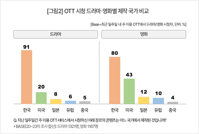 드라마와 영화의 제작국가별 시청경험률을 보면, 드라마의 경우 K드라마가 91%로 월등히 높았다. 미국이 20%로 그 다음이었고 일본·유럽·중국은 모두 한 자릿수에 그쳤다. K드라마 시청경험률은 토종 OTT인 티빙(96%), 쿠팡플레이(93%), 웨이브(90%) 뿐 아니라 넷플릭스(91%)도 모두 높았다.