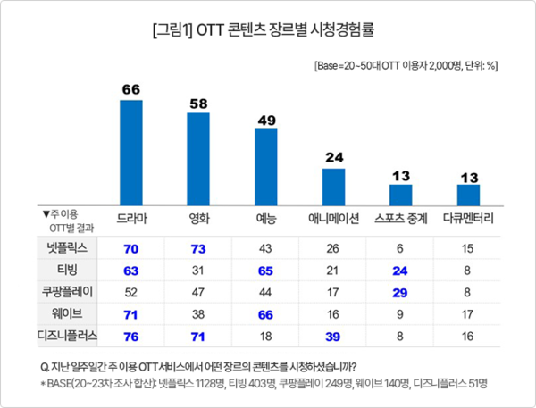 OTT 이용자가 가장 많이 시청한 장르(복수응답)는 드라마(66%)였고 이어 영화(58%), 예능(49%) 순이었다. 그 다음은 애니메이션(24%), 스포츠중계와 다큐멘터리(각각 13%)가 뒤를 이었다. 드라마와 영화는 거의 모든 OTT에서 시청경험률이 제일 높은 장르였는데 특히 넷플릭스(드라마 70%, 영화 73%)와 디즈니플러스(76%, 71%)는 둘 다 70% 이상이었다.