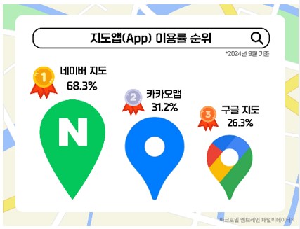 마크로밀 엠브레인 패널빅데이터® 의 ‘지도 앱’ 이용 관련 분석에 따르면, 올해 9월 기준 지도 앱 서비스별 이용률 순위는 네이버 지도가 68.3%로 1위를 차지했으며, 카카오맵(31.2%), Google 지도(26.3%)가 그 뒤를 잇는 것으로 나타났다.