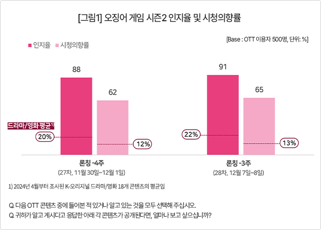 ‘오징어 게임 시즌2’는 론칭(12월 26일 예정) 전부터 인지율과 시청의향률 모두 역대최고치를 찍고 있다. 론칭 -4주(27차, 11월 30일~12월 1일) 조사 대상에 포함되자마자 인지율 88%, 시청의향률 62%로 신기록을 썼다. 일주일 후인 론칭 -3주(28차, 12월 7일~8일)에는 각각 91%, 65%로 다시 기록을 갈아치웠다. 론칭 -3주 기준 드라마·영화 평균(인지율 22%, 시청의향률 12%)을 압도하는 초유의 기록이다. 이전까지 가장 높았던 ‘흑백요리사’ 인지율(론칭 +2주, 82%)과 ‘지옥 시즌2’ 시청의향률(론칭 -1주, 39%)에도 크게 앞섰다.