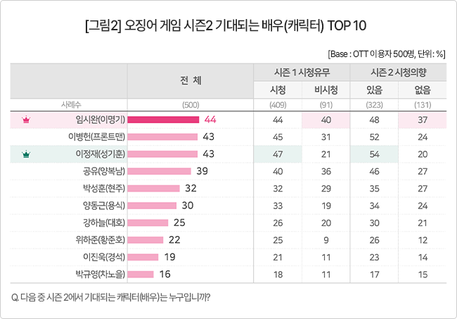 ‘시즌2’에서 기대되는 배우로는 이번에 새로 합류한 임시완(44%)과 이정재, 이병헌(각각 43%)이 거의 같은 비율로 팽팽했다. 이 중 임시완은 시즌1을 시청하지 않았거나 시즌2 시청의향이 없는 사람의 기대감이 상대적으로 높았다. 이 드라마에 대한 관심이 덜한 사람을 시청자로 끌어들이는 촉매 역할을 기대해볼 만하다.