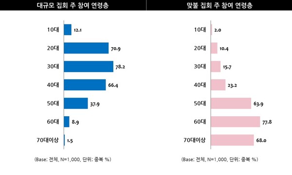 특히나 대규모 집회에 참여하는 주 연령대로 2030세대를 언급하는 경우가 많고, 맞불 집회는 고연령층이 주 참여자로 평가되고 있음에도 세대별 구분이 이전처럼 갈등의 주요 요인으로서 크게 작용하지 않고 있는 점은 집회가 특정 세대의 대립을 부추기는 곳이 아닌, 다양한 목소리가 공론화되는 공간으로 여겨지고 있다는 점에서 긍정적인 결과였다.