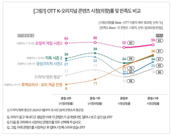 컨슈머인사이트의 ‘OTT K-오리지널 콘텐츠 초기 시청자 평가’ 제31, 32차 조사(12월 28~29일, 1월 4~5일)에서 넷플릭스의 ’24년 최대 화제작 드라마 ‘오징어 게임 시즌2’에 대한 OTT 이용자의 시청 경험과 평가를 비교했다.