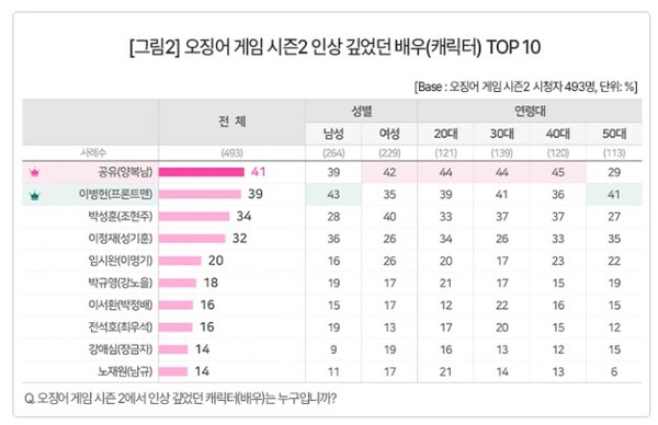 ‘가장 인상 깊었던 배우’ 1위는 공유(41%)가 꼽혔고, 이어 이병헌(39%), 박성훈(34%), 이정재(32%) 순이었다[그림2]. 공개 전 조사에서는 임시완, 이정재, 이병헌 순이었음을 고려하면 공유와 박성훈의 존재감이 크게 어필한 반면 핵심 캐릭터인 이정재의 주목도는 상대적으로 약했다.