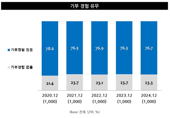 우선, 전체 응답자 10명 중 8명(76.7%)이 기부 경험이 있다고 밝힌 가운데, 그중 70.9%가 올해(2024년)도 기부 활동에 참여한 것으로 나타났다.