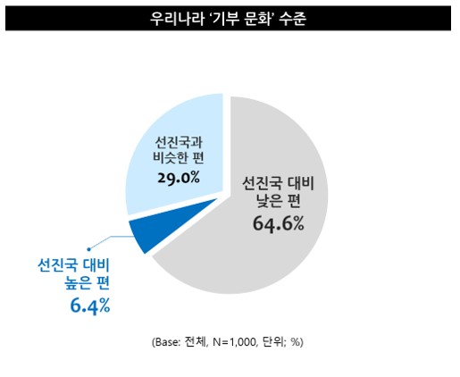전반적으로 기부 경험이 많고, 기부의 중요성을 높게 평가한 것과는 대조적으로 우리나라 기부 문화에 대한 신뢰도는 여전히 낮은 수준임을 확인할 수 있었다. 국내 기부 문화 수준이 다른 선진국 대비 낮은 편(64.6%) 이라는 응답이 다수를 차지한 것으로, 기부금 횡령 및 유용(54.0%, 중복응답), 기부를 받는 기관의 낮은 신뢰도(50.8%)가 주요 원인으로 지적되는 경우가 많았다.