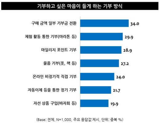 아울러 기부 의향을 갖게 하는 방식으로 구매 금액 일부를 기부금으로 전환하는 방식(34.0%, 중복응답)이나 체험 활동을 통한 기부(29.9%), 마일리지 포인트 기부(28.9%)를 주로 꼽아, 간접적인 기부 방식을 보다 선호하고 있는 모습을 살펴볼 수 있었다.