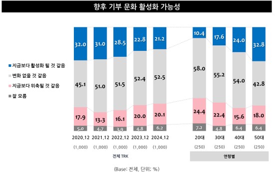 나아가 올해 기부단체들의 경영난은 더욱 심각해질 것이고(54.6%, 동의율), 기부금 수익은 예전만 못할 것(54.4%)이란 응답이 과반으로 평가되는 등 우려가 되는 결과를 보이기도 했다. 이에 따라 앞으로 한국에서 기부 문화가 더 확대될 것이란 기대는 이전 조사 대비 한층 낮아진 모습을 보였고(34.4%(2022) → 29.1%(2023) → 27.5%(2024)), 한국의 기부 문화는 지금과 큰 변화가 없을 것이란 예상이 많은 편이었다(우측 그래프 참조).