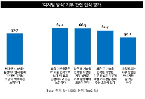 IT기술을 접목한 다양한 기부 방법이 기부 활성화에 도움이 된다(66.9%, 동의율)는 인식이 높고, 기부에 대한 거리감을 좁혀주는 효과가 있다는 응답이 62.7%에 달한 결과를 보인 것으로, 마음에 드는 기부 방법은 아니지만 필요는 하다(50.2%)는 인식이 적지 않았다.