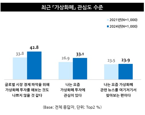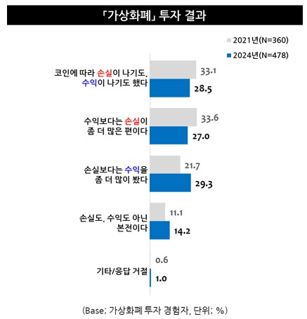 부동산이나 주식 등 다른 투자 방법보다 가상화폐의 성과가 제일 좋을 것 같다(16.8%(2021) → 30.4%(2024))는 인식이 크게 증가한 것으로, 가상화폐 투자를 하면 만족할 만한 수익을 얻을 수 있을 것 같다(13.6%(2021) → 24.9%(2024))는 기대감도 한층 높아진 모습을 보이고 있었다.