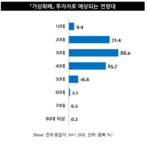 실제로 전체 응답자의 대다수가 2030 세대를 가상화폐의 주요 투자 연령층으로 꼽아(우측 그래프 참조), 이들 세대가 가상화폐 시장에서 주도적인 역할을 하고 있음을 예상해 볼 수 있었다.