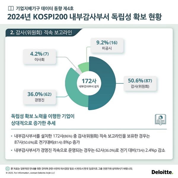 한국 딜로이트 그룹(총괄대표 홍종성)의 기업지배기구발전센터(CCG, Corporate Governance Center)가 17일 발표한 ‘기업지배기구 데이터 동향’ 제4호에 따르면, 코스피200 상장법인 기업지배구조 핵심지표 준수 현황에 ‘독립적인 내부감사부서 설치’를 공시한 85개사 중 감사(위원회) 직속 보고라인과 내부감사부서 책임자 임면동의권을 모두 갖춘 기업은 43곳(50.6%)에 그쳤다.