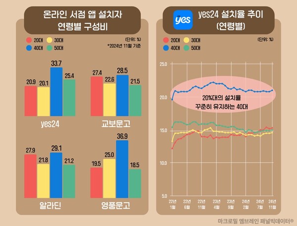 주목할 만한 점은 20대를 중심으로 한 ‘교보문고’와 ‘알라딘’의 성장세다. 교보문고와 알라딘의 경우 20대의 설치자 수가 전년 동기(2023년 11월) 대비 각각 39.1%, 23.9% 성장세를 보이며, 40대 설치율을 앞지른 것으로 나타났다.