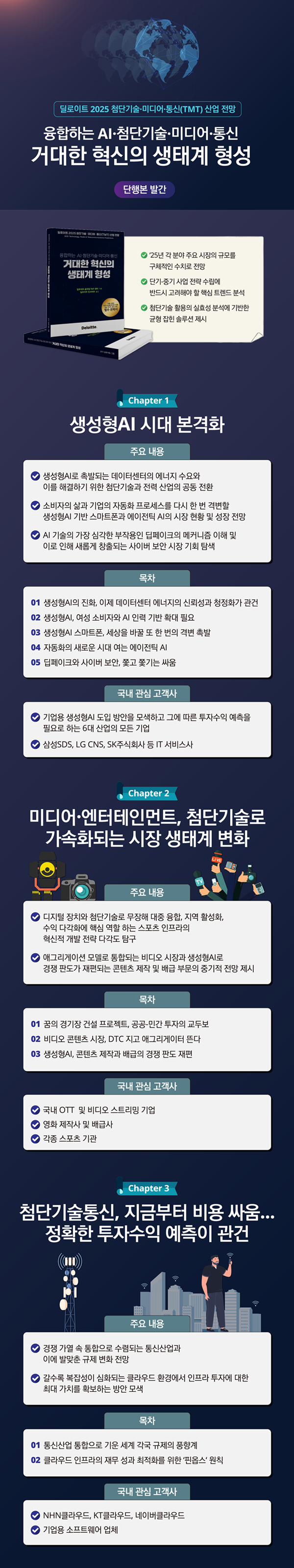 2025년 1월 23일_생성형 AI 및 클라우드를 비롯한 첨단기술, 나아가 미디어 전반의 대격변이 벌어지는 가운데, 한국 딜로이트 그룹이 2025년 기술 및 미디어, 통신 산업(TMT)의 주요 트렌드를 조망하는 ‘딜로이트 2025 첨단기술·미디어·통신 산업 전망’ 리포트를 발표했다. 이번 보고서는 글로벌 TMT 산업이 직면할 주요 변화와 그 영향에 대한 분석을 담고 있다.