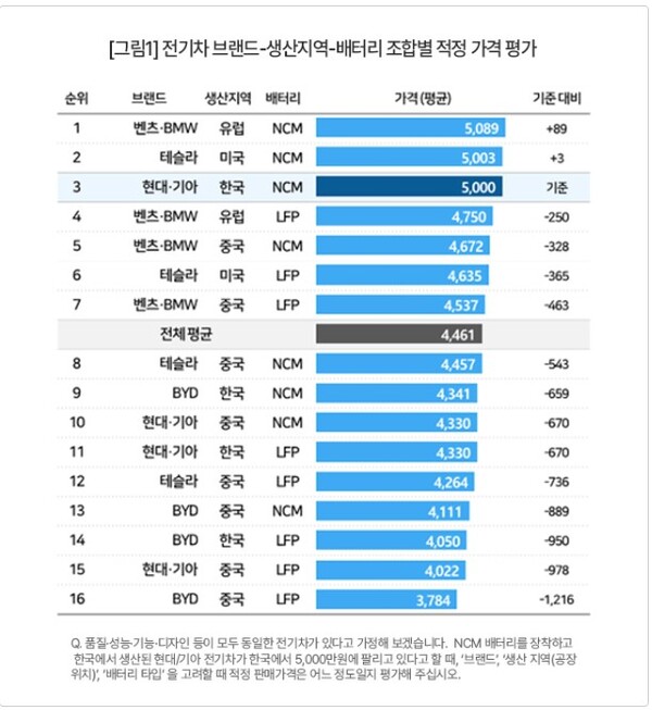16개 조합 중 소비자가 평가한 적정 가치 1위는 `벤츠·BMW-유럽-NCM 배터리`(5089만원)였고, 2위는 `테슬라-미국-NCM` 조합(5003만원)이었다[그림1].