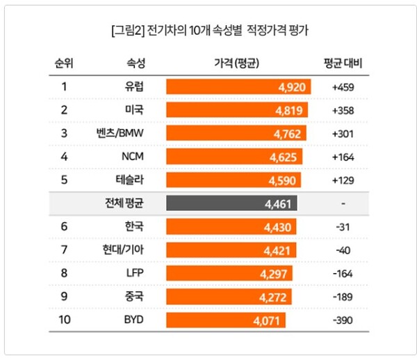 소비자가 가장 높게 평가한 조합은 `벤츠·BMW가 유럽에서 만든 NCM 배터리 차`였다. 가장 낮게 평가된 조합은 `BYD가 중국에서 만든 LFP차`였는데, 이는 `현대·기아차가 한국에서 만든 NCM 배터리 차` 가치의 76% 수준이었다.