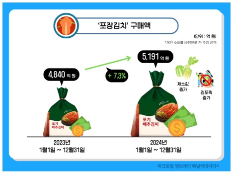 우선, 지난해 1월 1일부터 12월 31일까지 대형마트 및 편의점 등에서 판매된 ‘포장김치’ 구매 추정액은 5,191억 원으로, 전년 동기 대비 7.3% 증가한 것으로 나타났다.