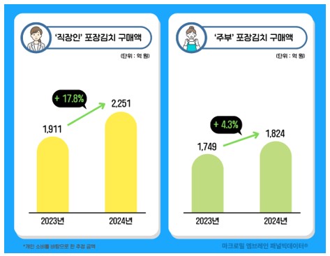 특히, 직장인과 전업주부가 포장김치의 주요 구매층으로 부상하고 있다는 점이 주목할 만하다. 2024년 직장인의 포장김치 구매 추정액은 2,251억 원으로, 지난해 같은 기간 보다 17.8%의 큰 성장세를 보였고, 전업주부의 구매액(1,824억 원) 역시 4.3% 증가해 안정적인 수요를 유지하고 있는 것으로 나타났다.