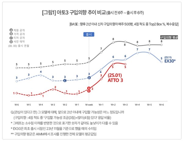 아토3의 인지율과 구입의향(이하 W+3주 기준 24%, 5%)은 경쟁모델로 거론되는 기아의 ‘EV3’(60%, 22%)나 현대차 ‘코나 일렉트릭’(45%, 14%)에 비하면 아직 크게 열세다. 그러나 비슷한 수입 전기 SUV 모델인 볼보 ‘EX30’(13%, 6%)과 비교하면 인지율은 크게 앞서고 구입의향은 엇비슷하다.