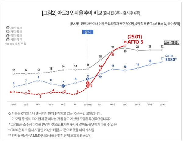 인지율 상승세는 더 가팔랐다. 출시 전 6주간 내내 3%대를 유지해 전체 평균(14%대)에 크게 미달하다가 출시 후에는 22%(W+2), 24%(W+3)로 급등해 단기간에 평균(각각 22%, 23%)을 따라잡았다[그림2]. 출시 직후 소비자 반응이 동반 상승하는 게 일반적인 패턴이긴 해도 아토3의 인지율 상승세는 특히 괄목할 만하다. 예상보다 낮은 판매가격이 관심을 끌어들인 것으로 보인다.