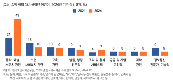 한국보건사회연구원은 어린이(초4~6학년) 대상 조사를 3년 단위로 진행하는데 보고서 내용 중 어린이의 장래희망 변화 추이를 살펴본다.