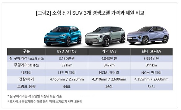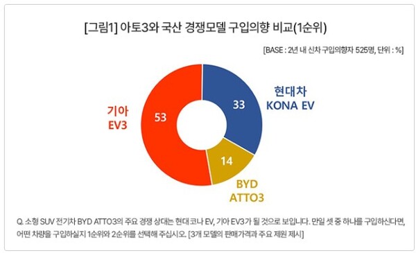 자동차 리서치 전문기관 컨슈머인사이트는 2021년 11월 시작한 주례 신차 소비자 초기 반응(AIMM : Auto Initial Market Monitoring) 조사(표본규모 : 2년 내 새차 구입의향자 500명)에서 중국 BYD가 1월 16일 국내 출시한 전기 SUV ‘아토3’와 국산 동급 경쟁 모델인 기아 ‘EV3’, 현대차 ‘코나 일렉트릭’ 구입의향을 비교했다. 각 모델의 실구입가격, 1회 충전시 주행거리, 배터리 종류 등 주요 제원을 제시한 후 1순위 구입의향 모델을 기준으로 비교했다.