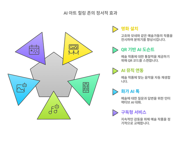 스마트폰으로 QR을 스캔하면, AI가 마치 미술관 도슨트처럼 작품에 담긴 상징, 작가의 인생, 시대적 배경을 따뜻한 목소리로 들려준다. 여기에 함께 제공되는 AI뮤직은 긴장을 부드럽게 녹인다.