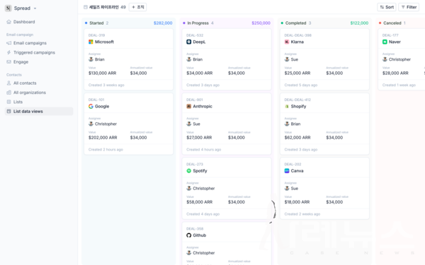 그런데 CRM으로 고객을 관리하는 데서 한 걸음 더 나아가, '고객을 새롭게 만들고 관계를 확장할 수 있는 도구도 필요하지 않을까'라는 고민이 생겼습니다. 특히 많은 B2B 기업이 이메일을 주요 채널로 활용하고 있었고 단순한 대량 발송이 아닌 ‘판매가 일어나는 메일’을 보낼 수 있다면 더 큰 가치를 줄 수 있겠다고 판단했습니다. 그렇게 시작된 것이 ‘스프레드’입니다.