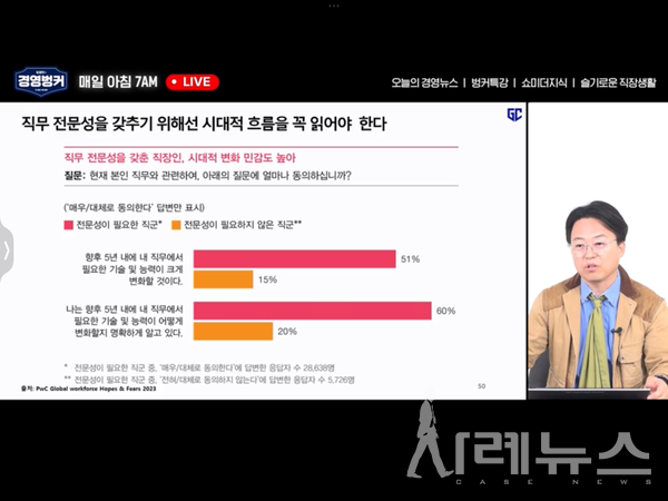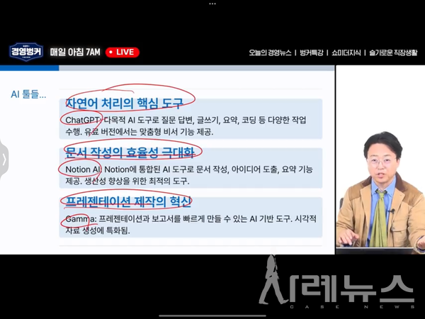 [사례뉴스=오세은 인턴기자] 지난 5월 9일 가인지TV 유튜브에서 ‘김경민의 경영벙커’ 라이브 방송이 진행됐다. 라이브에서 가인지컨설팅그룹 김경민 대표는 단순 반복 업무는 물론 고차원적인 정보처리까지 대체 가능한 인공지능(AI)의 시대, 기업과 개인 모두 새로운 생존 전략이 필요하다는 메시지를 던졌다.