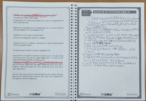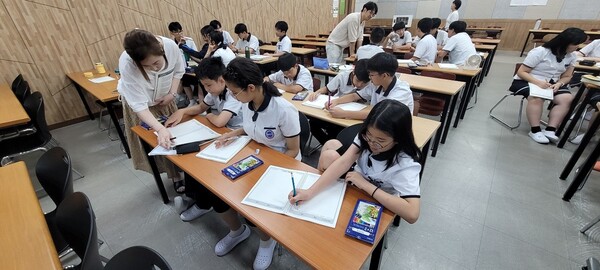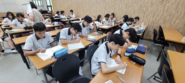 학생들은 각자 준비된 교재를 읽으며 중요한 부분에는 빨간 줄,