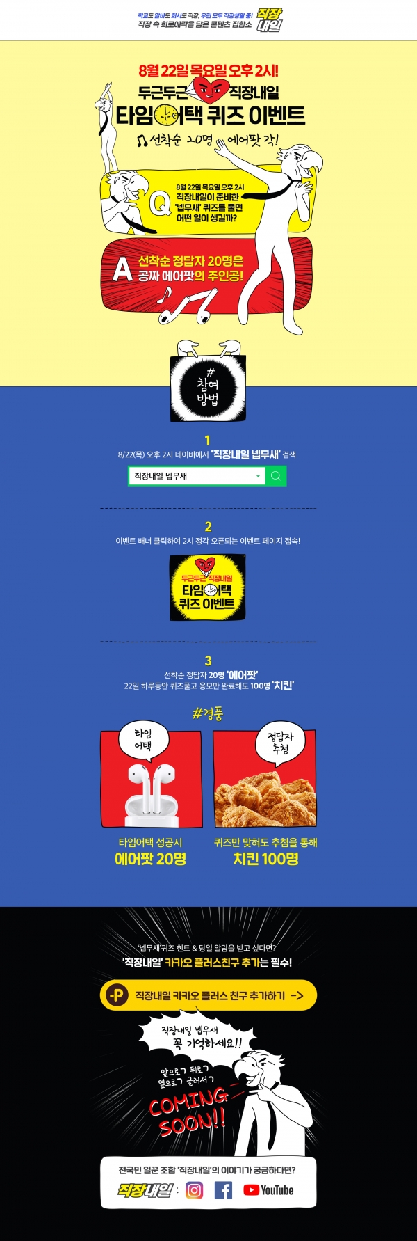 직장 속 희로애락을 담은 콘텐츠 집합소 직장내일이 22일(목) 오후 2시 선착순 20명에게 에어팟을 증정하는 타임어택 이벤트를 진행했다고 밝혔다.