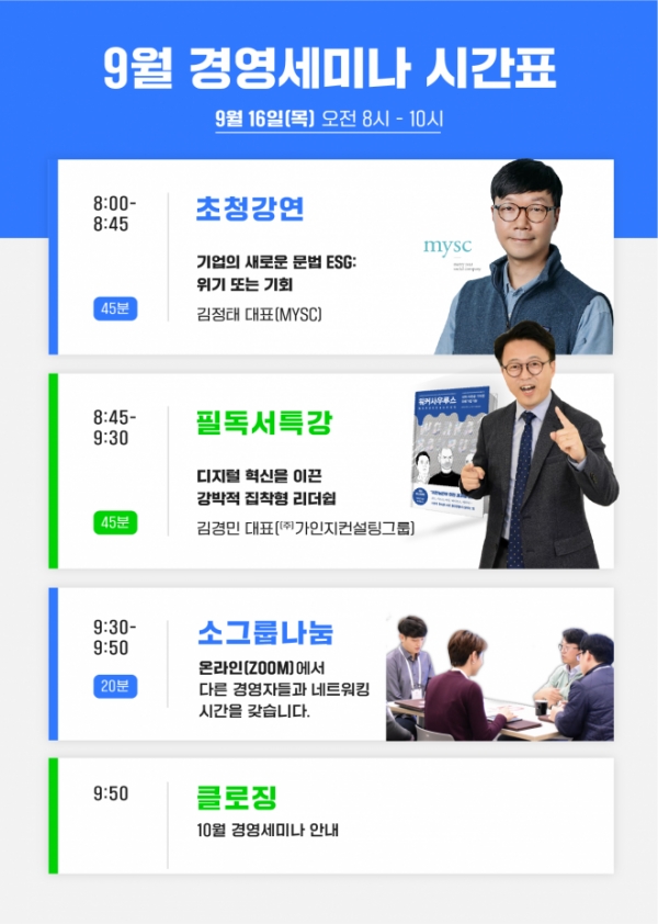 '경영필독서클럽'에서는 경영자를 위한 경영 필독서 선정과 인사이트 공유도 계속 된다. 가경세에 대한 문의는 김사랑 연구원(02-337-0691, daisy@gainge.com)으로 하면 된다.