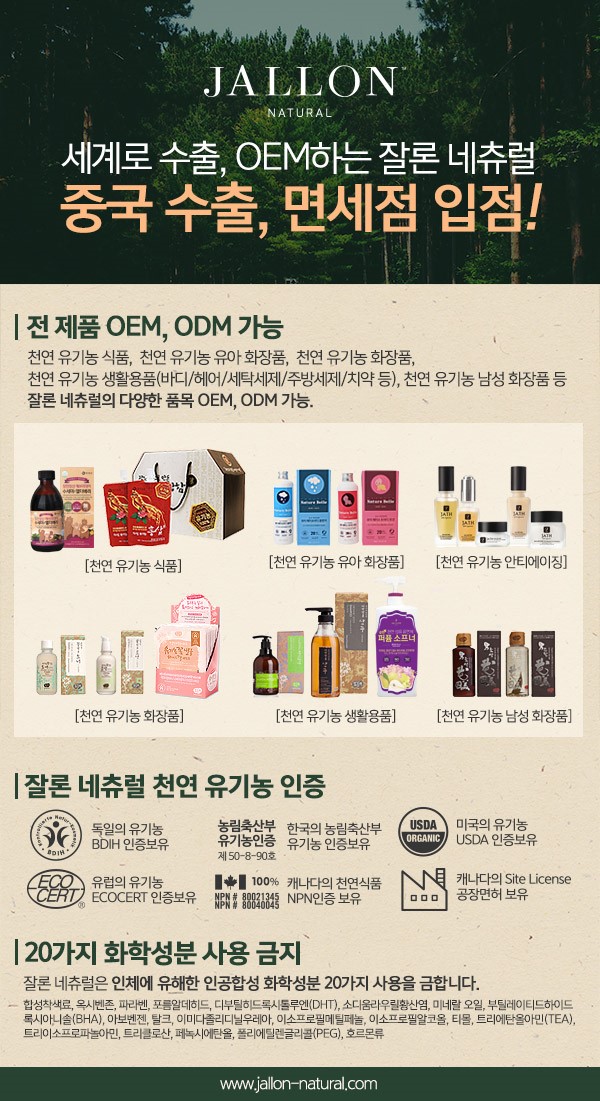 ‘잘론네츄럴’은 자연을 그대로 담은 천연, 유기농 원료를 사용해 화장품, 건강식품 등을 생산한다. 특히 천연 유기농 함량을 99.98%까지 높힌 화장품을 생산할 수 있는 기술력을 갖추었다. 유기농 함량이 높은 화장품의 경우‘발림이 좋지 않은 특성, 밀리는 특성, 흡수가 느리다는 단점’이 있는 데 이 문제를 모두 해결했다. 이는 독일과 미국 등지에서 EDIH, ECOCERT, USDA, NPN, 더마테스트 등 까다로운 유기농 인증을 받아 안정성과 기술력을 인정 받았기에 가능한 일이었다.
